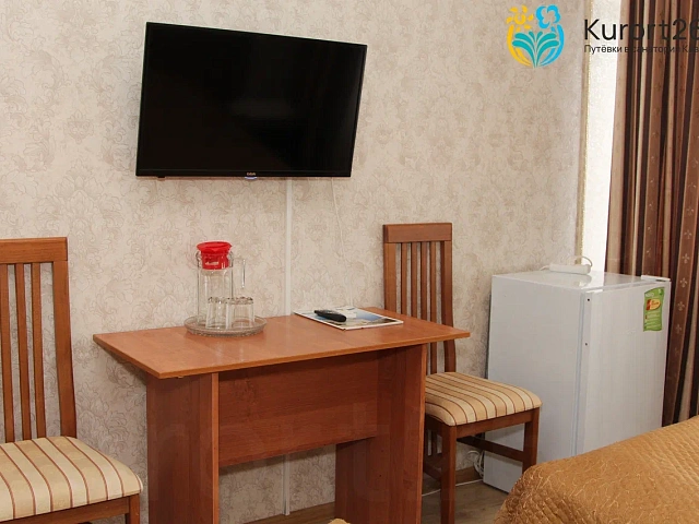 холодильник, телевизор, санузел с душевой кабиной, ванные принадлежности, двуспальная кровать, шкаф, прикроватные тумбочки, стол