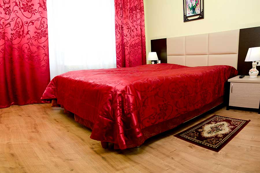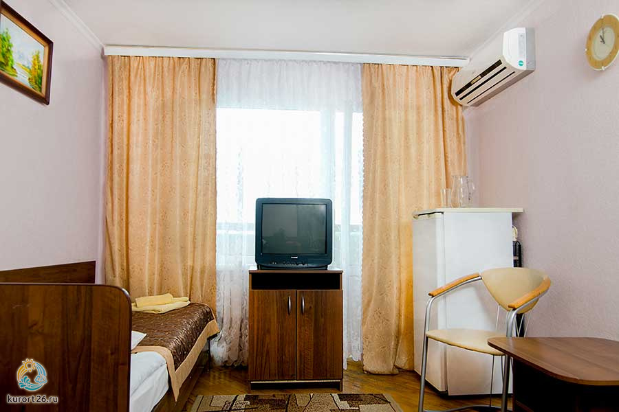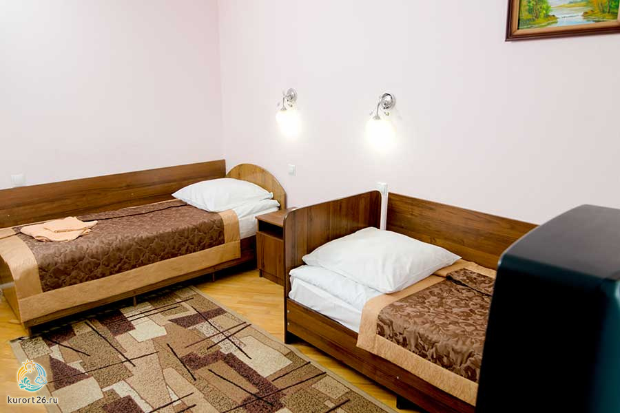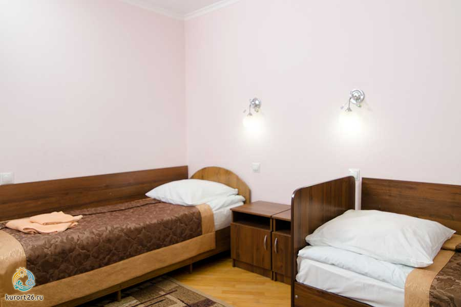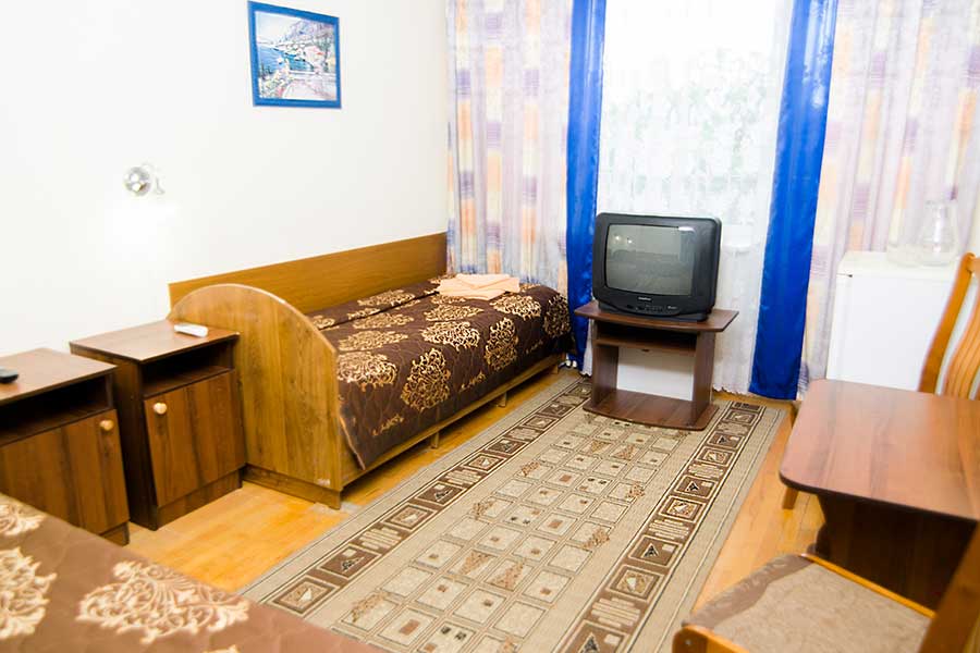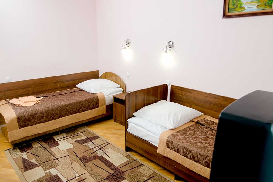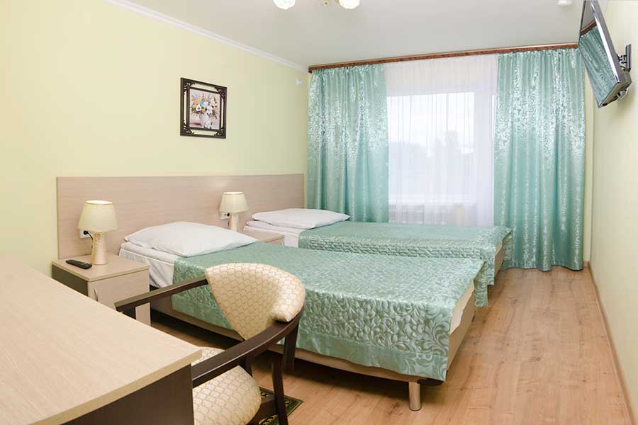 В номере: две односпальные кровати, две прикроватные тумбочки, шкаф, стулья, зеркало, стол, санузел с душем (поддон). К услугам гостей телевизор, холодильник, электрочайник, чайный набор посуды, кондиционер. Возможна установка дополнительного места (еврораскладушка).